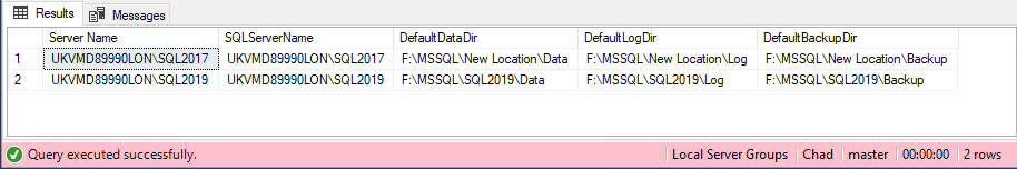 That’s all good and well for one SQL Server instance, but if you want to check the default directories across many instances, then you don’t want the code outputting 3 different result sets in the query window. You can add an output variable to each of the regread executions and save the values to a variable. I’ve also added a server name column so it’s easy to tell what SQL Server instance the default directories are for.