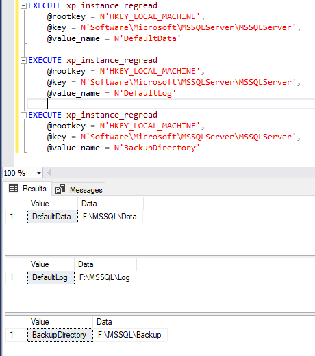 Changing the default directory using the code is just as easy as reading what the directories are as we did before. You can run the below code using the xp_instance_regwrite stored procedure to change the values: