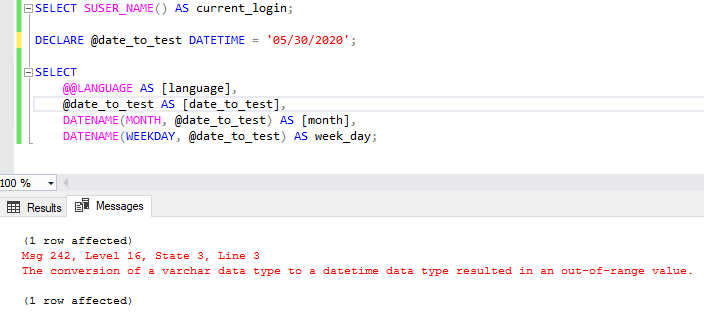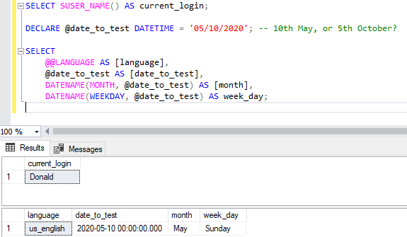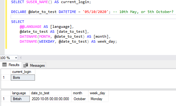 There are a few ways to ensure this mismatch doesn’t happen. The first way is to write your queries using a date format that’ll work no matter what the default language is set to – yyyymmdd format. You can’t go wrong. Donald and Boris both agree on this – they now output the same, 5th October 2020: